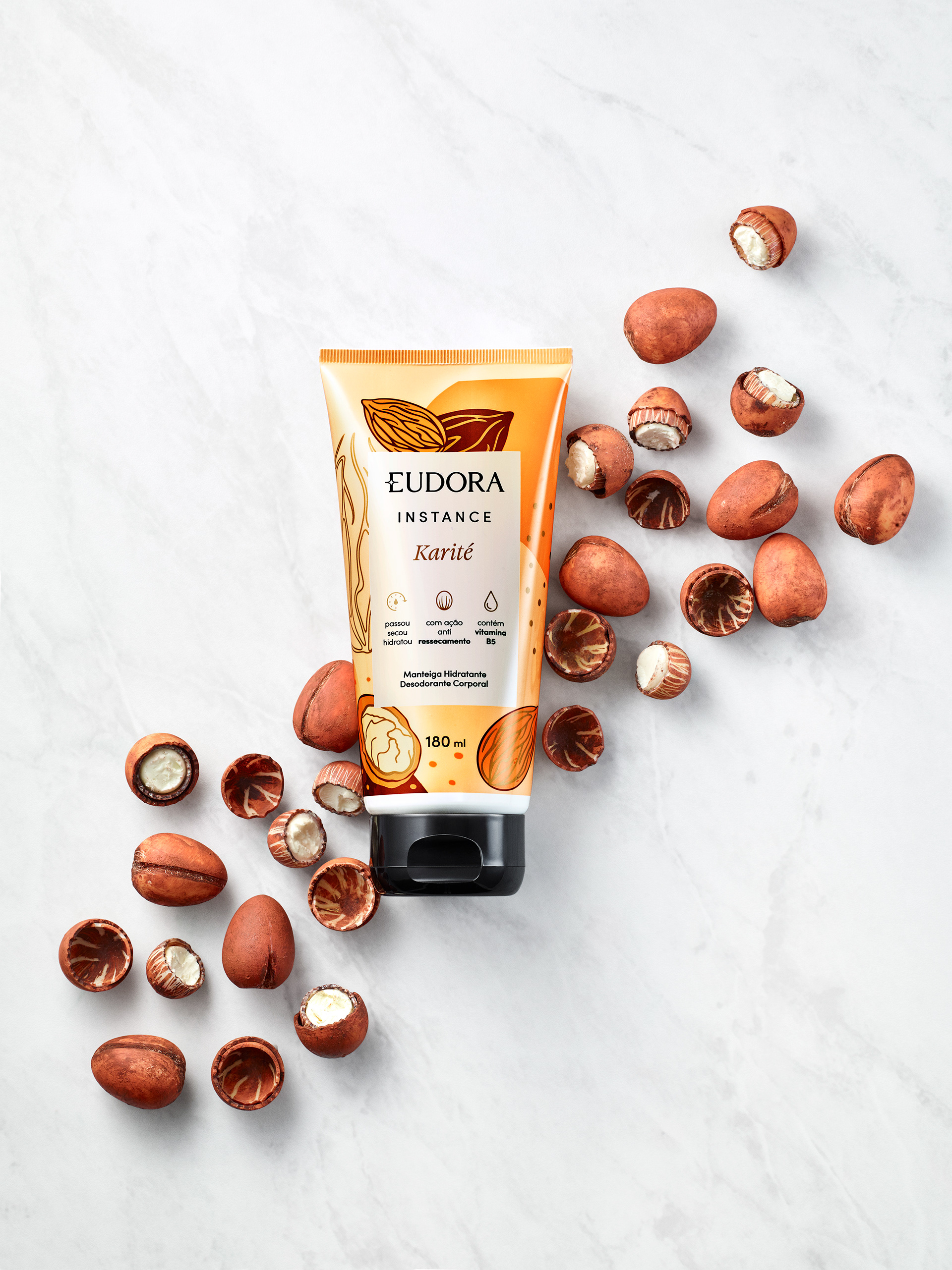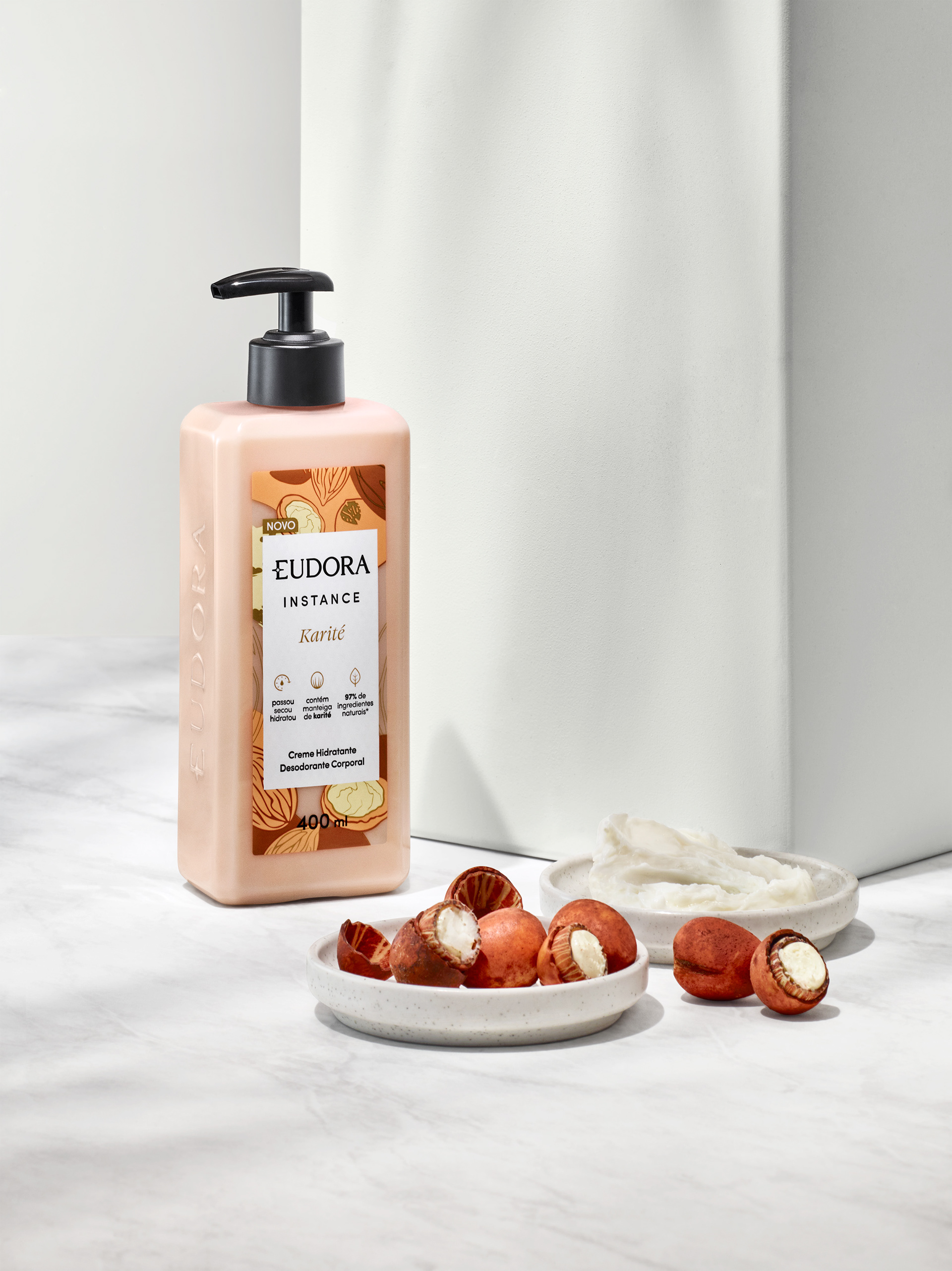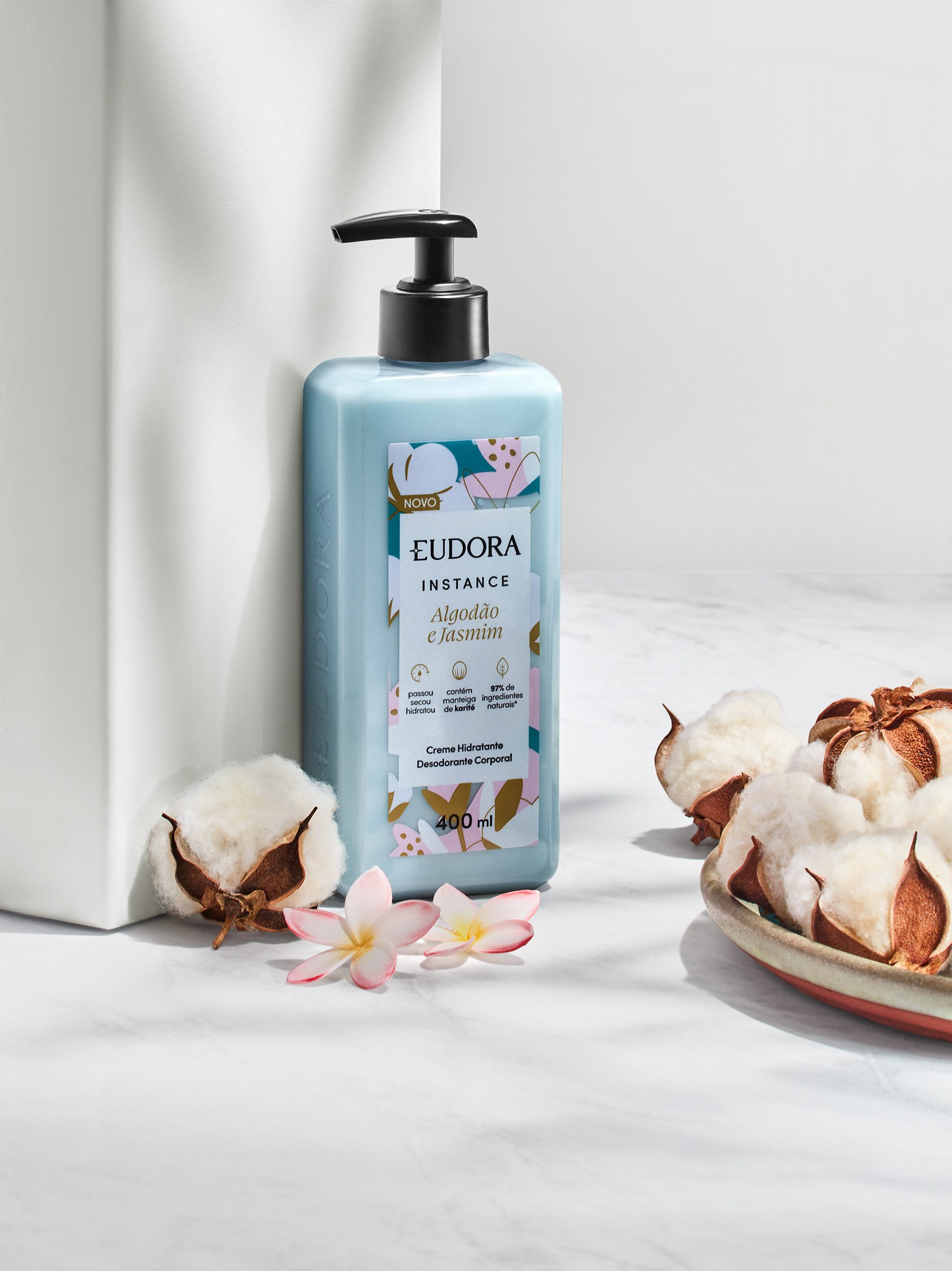 Fotos still para campanha de lançamento das novas embalagens de Eudora Instance, linha de produtos para cuidado corporal da marca.